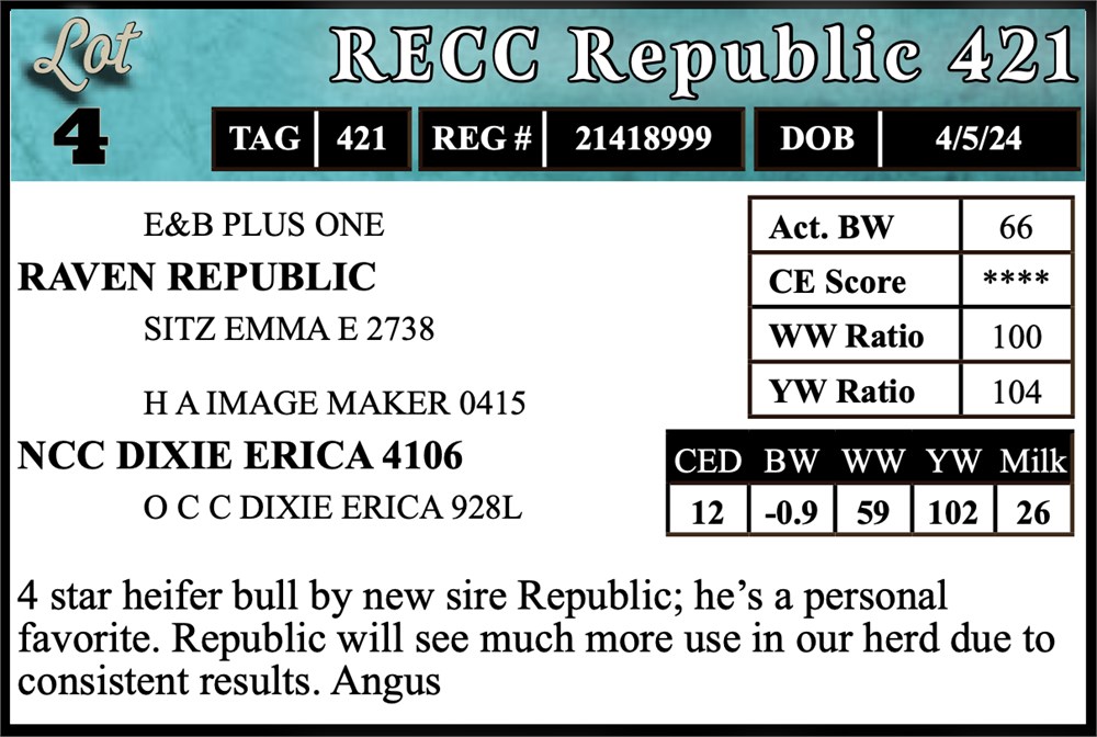 4 star heifer bull by new sire Republic; he’s a personal favorite. Republic will see much more use in our herd due to consistent results. Angus.