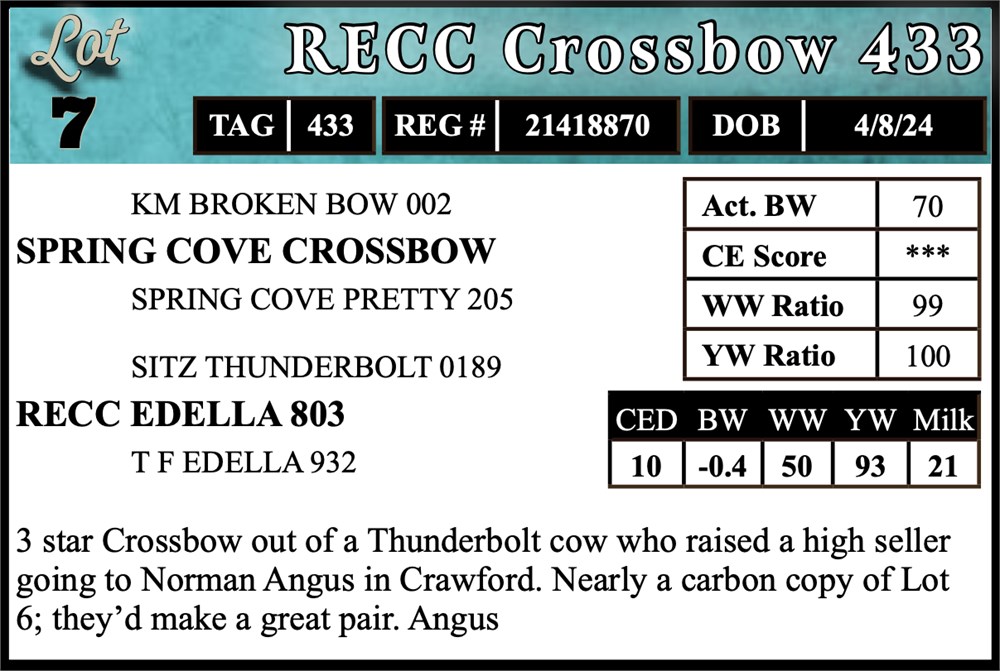 3 star Crossbow out of a Thunderbolt cow who raised a high seller going to Norman Angus in Crawford. Nearly a carbon copy of Lot 6; they’d make a great pair. Angus.