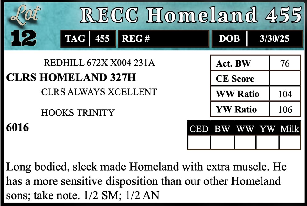 Long bodied, sleek made Homeland with extra muscle. He has a more sensitive disposition than our other Homeland sons; take note. 1/2 SM; 1/2 AN