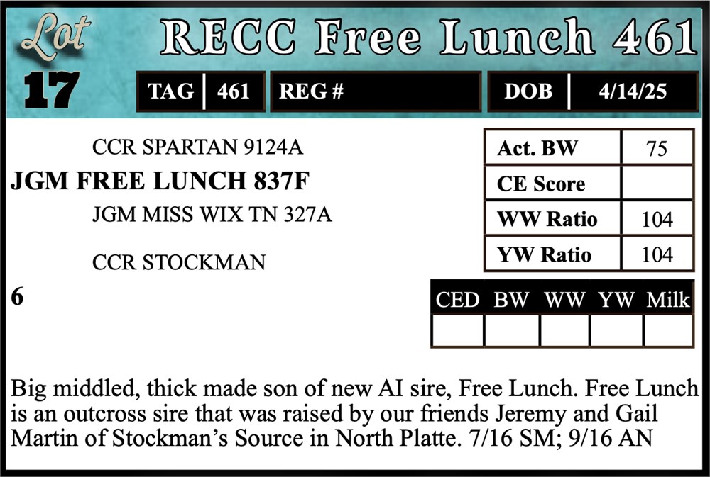 Big middled, thick made son of new AI sire, Free Lunch. Free Lunch is an outcross sire that was raised by our friends Jeremy and Gail Martin of Stockman’s Source in North Platte. 7/16 SM; 9/16 AN