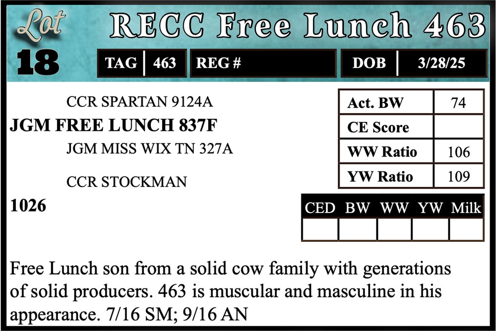 Free Lunch son from a solid cow family with generations of solid producers. 463 is muscular and masculine in his appearance. 7/16 SM; 9/16 AN